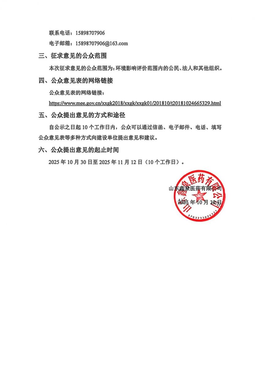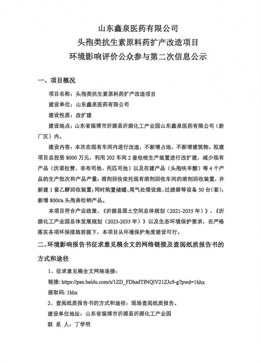 山东鑫泉医药有限公司头孢类抗生素原料药扩产改造项目环境影响评价公众参与第二次信息公示